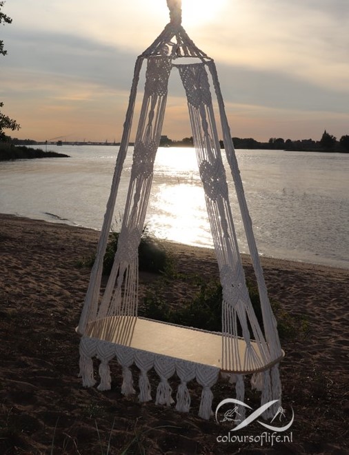 Deze stijlvolle schommel is een echte blikvanger – perfect om te stylen met kussens, plaids of hangplanten en in je loungeruimte of tuin te hangen. Een superleuk DIY- project met wat uitdaging! De schommel is met een MDF bodem en Durable Rope garens gemaakt. De garens zijn verkrijgbaar is diverse kleuren. De MDF bodem kan ook voor babywieg gebruikt worden.